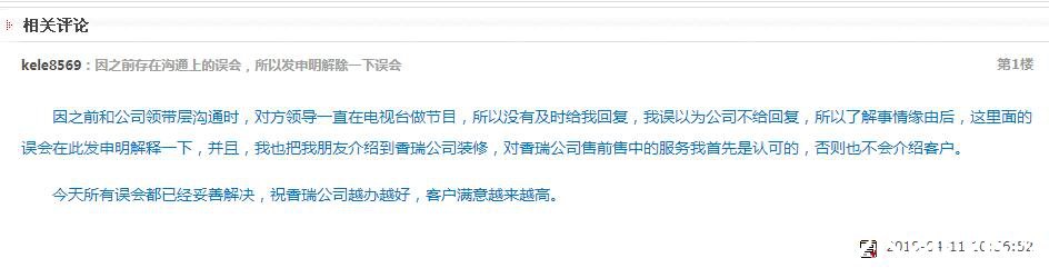 “因之前和公司領(lǐng)帶層溝通時,對方領(lǐng)導(dǎo)一直在電視臺做節(jié)目,所以沒有及時給我回復(fù),我誤以為公司不給回復(fù),所以了解事情緣由后,這里面的誤會在此發(fā)申明解釋一下,并且,我也把我朋友介紹到香瑞公司裝修,對香瑞公司售前售中的服務(wù)我首先是認(rèn)可的,否則也不會介紹客戶。今天所有誤會都已經(jīng)妥善解決,祝香瑞公司越辦越好,客戶滿意越來越高。”