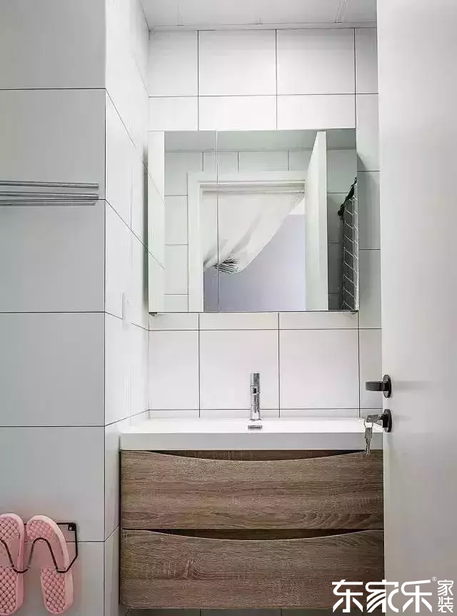 衛(wèi)生間簡(jiǎn)單干凈,給人一種寧?kù)o感。嵌入式的洗手盆設(shè)計(jì),不僅可以減少空間占用,同時(shí)使用起來非常方便。懸空的浴室柜可以減少衛(wèi)生死角,方便日常打掃。