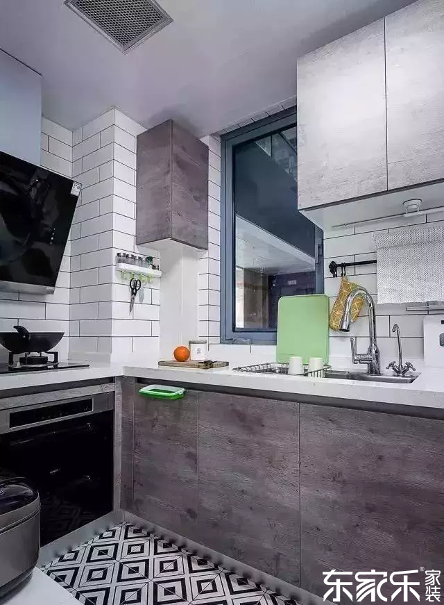 廚房采用L型的設(shè)計(jì),做了櫥柜和吊柜方便收納,還見縫插針的安置掛架,墻面貼了北歐風(fēng)的白色小瓷磚,地面是幾何圖案的黑白地磚,容易清理的同時(shí)又很時(shí)尚。