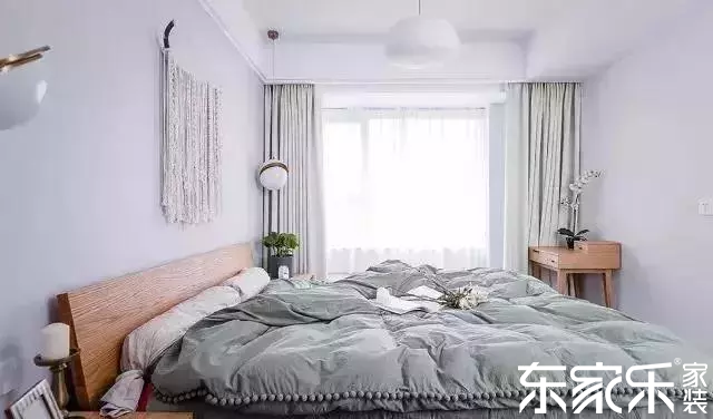 大大的窗子,灰色的窗簾,很文藝的感覺。臥室里是原木的大床,還有原木的柜子,搭配同樣是灰色的床鋪,很安靜,很悠閑。別致的床頭燈真的非常有設(shè)計(jì)感。在床頭背景墻上掛了掛毯,簡(jiǎn)簡(jiǎn)單單的掛毯更加浪漫。