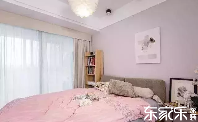 次臥給人的感覺就是溫柔浪漫,淡淡的粉色不顯俗氣,反而顯得浪漫溫柔,小編很喜歡次臥里的吊燈,溫溫柔柔的,與世無爭(zhēng)的。