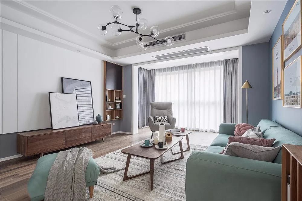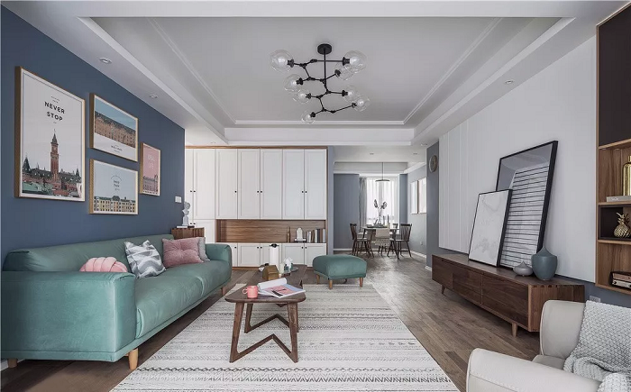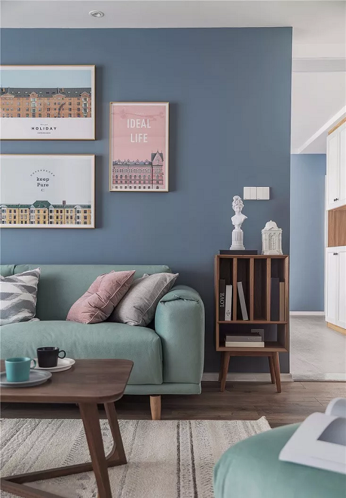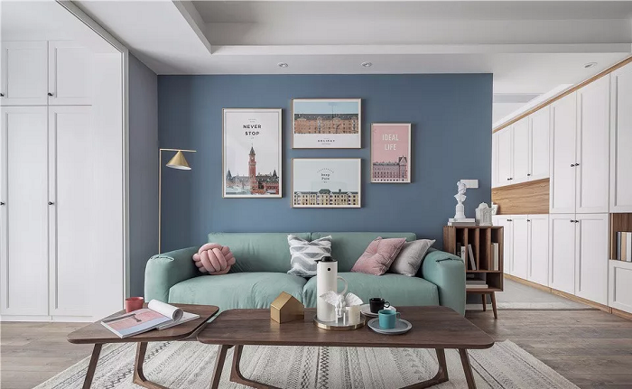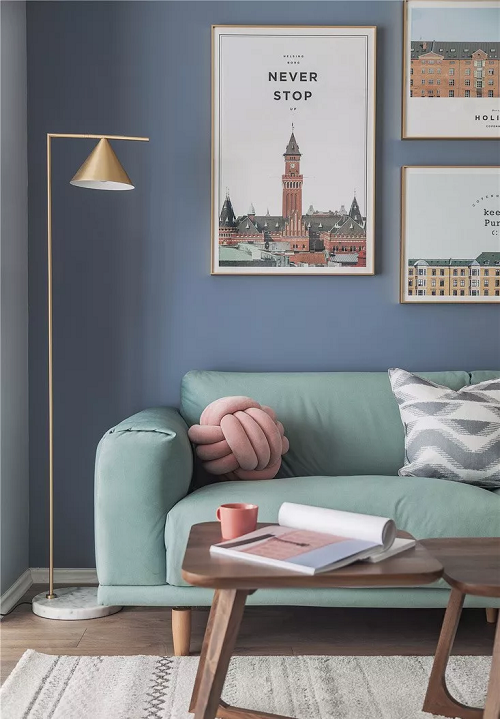 客廳用藍色的背景墻搭配幾幅城市建筑裝飾畫來提升顏值,綠色的布藝沙發(fā),讓空間充滿了無限的活力。