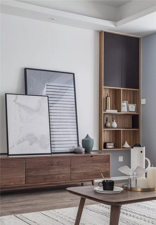 原木風(fēng)的電視柜與茶幾風(fēng)格統(tǒng)一,旁邊墻面位置還有收納格,可用用來擺放一些工藝品或裝飾品。