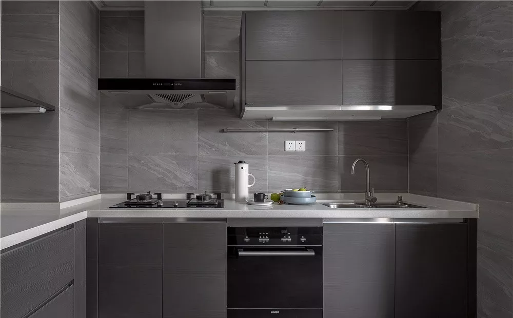 廚房整體采用暗灰色調(diào),L型櫥柜+吊柜組合干凈又整潔,還提供了超強的收納空間。