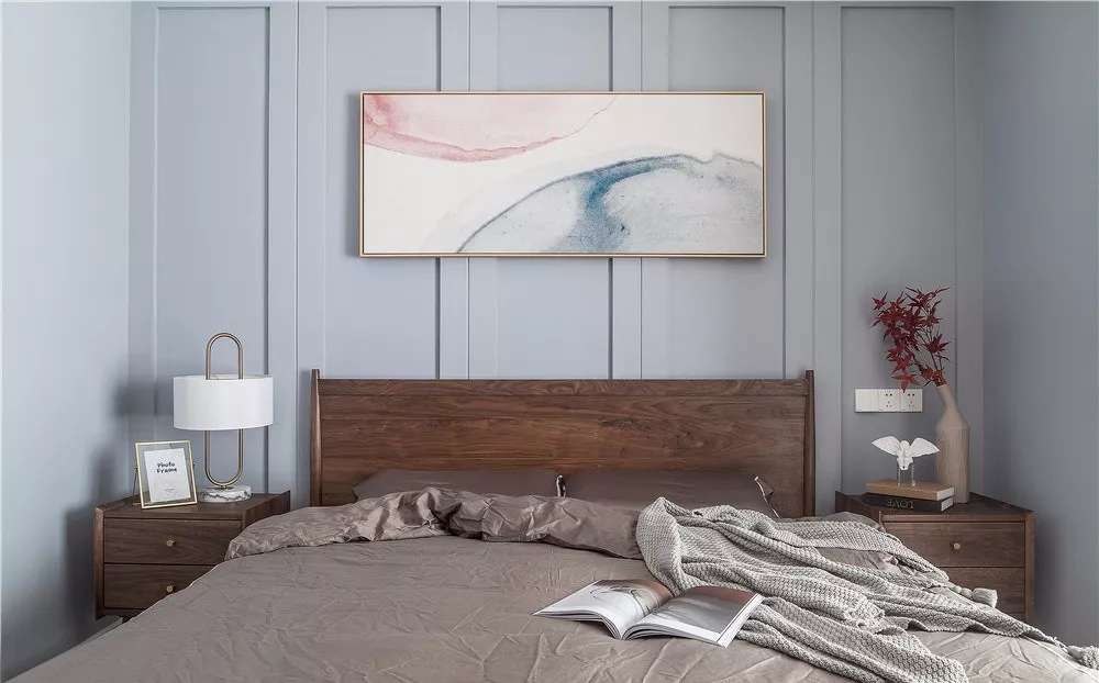 主臥整體以淺藍色為主,實木床搭配床頭柜與客廳家具相匹配,清新舒適,搭配起來統(tǒng)一和諧。