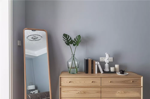 床尾墻角的空間加以利用,擺放了一個淺木色的斗柜,還有穿衣鏡,這樣每天出門前整理整理自己的穿搭就非常方便。