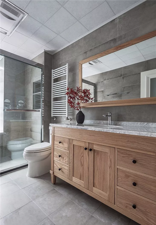 衛(wèi)生間比較寬敞,洗漱區(qū)設(shè)計了一個大洗漱臺,大臺面可以擺放洗漱用品,底部的收納柜+鏡柜提供不小的收納空間。