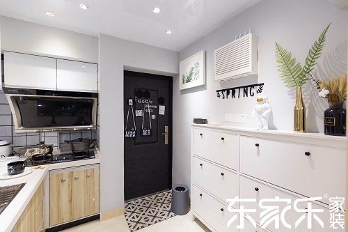 由于戶型的關(guān)系玄關(guān)沒有獨(dú)立空間,只能在進(jìn)門靠墻的位置做了一組玄關(guān)柜,右側(cè)是廚房的位置,這樣規(guī)劃合理的利用進(jìn)門空間,實(shí)用又寬敞。