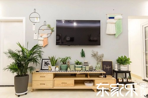 客廳空間相比之下就寬敞很多,整體采用原木+灰+綠搭配,讓客廳散發(fā)出一種小清新的味道。