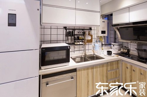 廚房采用 L型布局,為保證收納,采用了上下吊柜+墻面掛鉤設(shè)計(jì),讓廚房不雜亂。