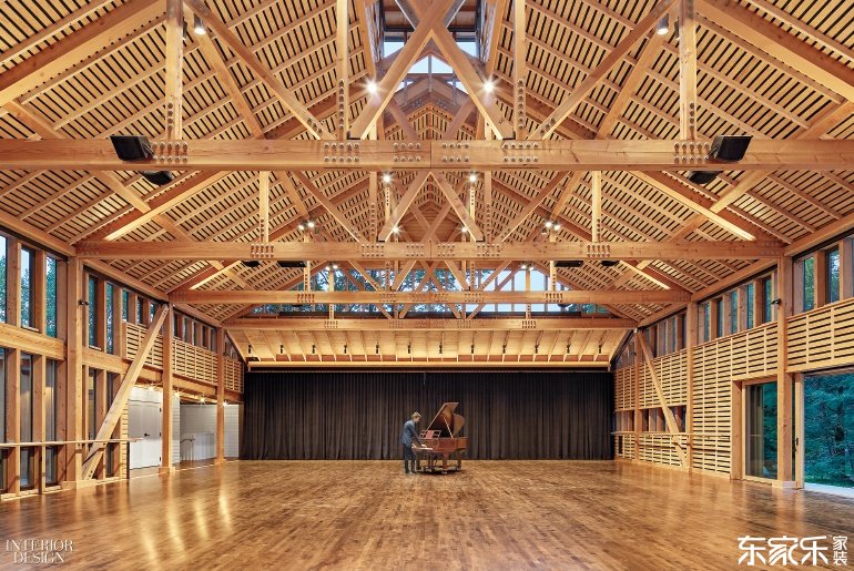 在堅(jiān)持流行的鄉(xiāng)土風(fēng)格的同時(shí),該工作室“非常適合我們這個(gè)時(shí)代”,弗蘭斯堡總裁David Croteau說(shuō)。傳統(tǒng)谷倉(cāng)設(shè)計(jì)有水晶圓屋頂,環(huán)繞式天窗和兩個(gè)窗戶墻?所有這些玻璃讓舞者可以欣賞到伯克希爾山的風(fēng)景,同樣重要的是,參觀者可以在里面看到舞者們?cè)诰毩?xí)。除玻璃以外,這座面積達(dá)7400平方英尺的建筑是一種木結(jié)構(gòu)建筑:外部采用西部紅柏樹(shù),內(nèi)部墻壁和天花板采用道格拉斯冷杉和松木,彈性地板采用染色楓木。梁和桁架支持燈光以及揚(yáng)聲器系統(tǒng),這對(duì)參加者坐下時(shí)幾乎是看不見(jiàn)的。順便說(shuō)一下,座椅解決方案聰明但技術(shù)含量低。為了沿著一側(cè)補(bǔ)充陽(yáng)臺(tái),從陽(yáng)臺(tái)底部滑出的平臺(tái)可以容納額外的折疊椅,在不需要時(shí)存放在衣柜中。