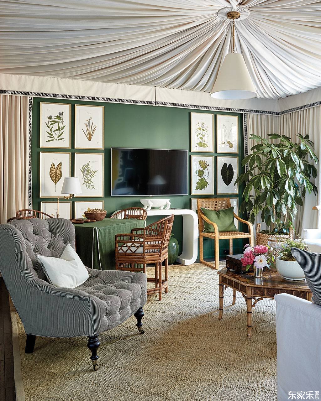 在電視機周圍創(chuàng)建一些命令,將注意力從屏幕上移開。我們非常喜歡建筑師比爾·英格拉姆(Bill Ingram)在2016年創(chuàng)意之家廚房的保管室里掛上平板電視的方式。 在兩張植物版畫的網(wǎng)格之間,比爾直接將平板安裝在控制臺上的墻上。電視很明顯,但絕不是房間的焦點。
